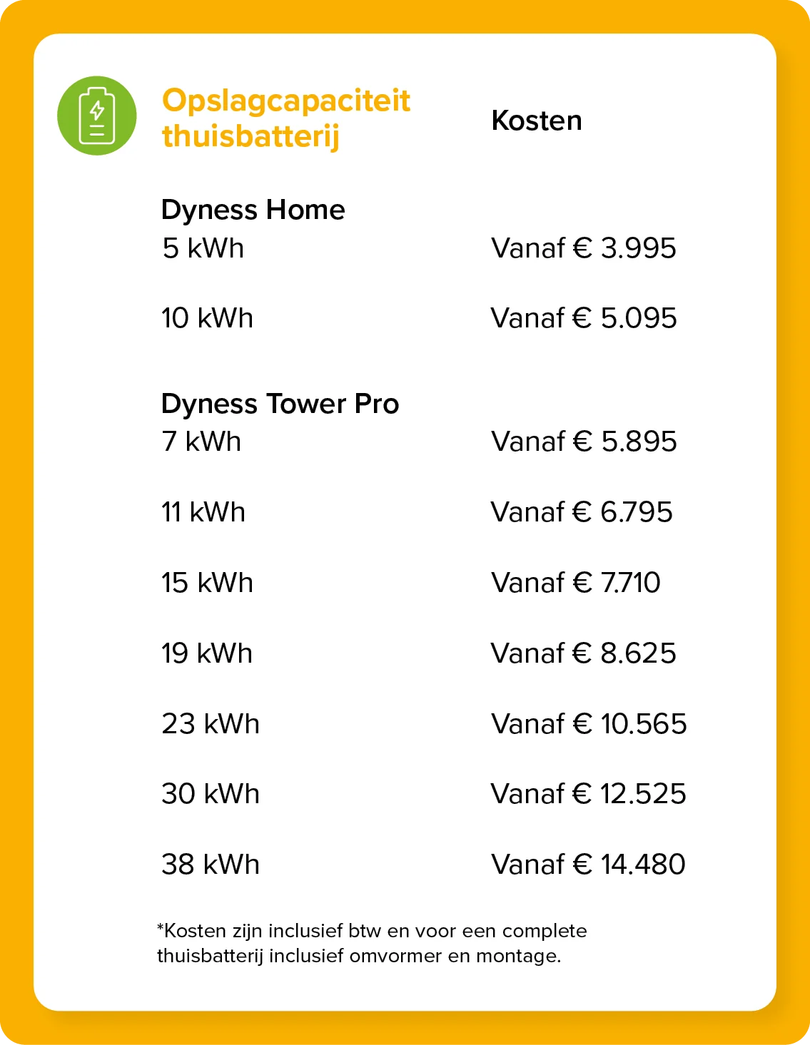 Wij bieden twee verschillende soorten slimme thuisbatterijen aan, de Dyness Home en de Dyness Tower Pro. De Dyness Home is een budgetvriendelijke thuisbatterij en biedt een compacte oplossing waarmee je terugleverkosten kunt voorkomen. De Dyness Home is beschikbaar in 5 kWh en 10 kWh vanaf € 3.995.
